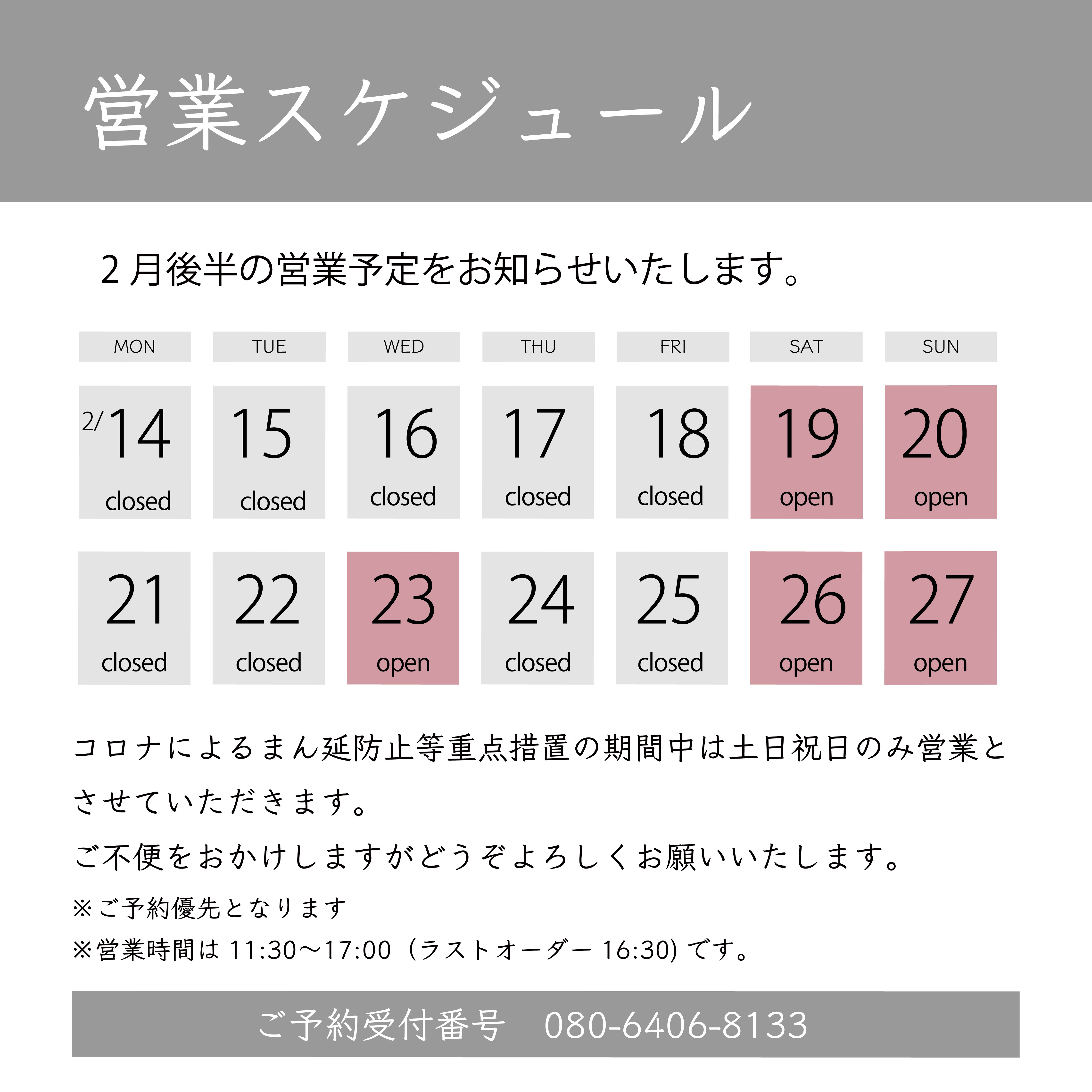 コロナによるまん延防止等重点措置の期間中は、土日祝日のみの営業とさせていただきます。