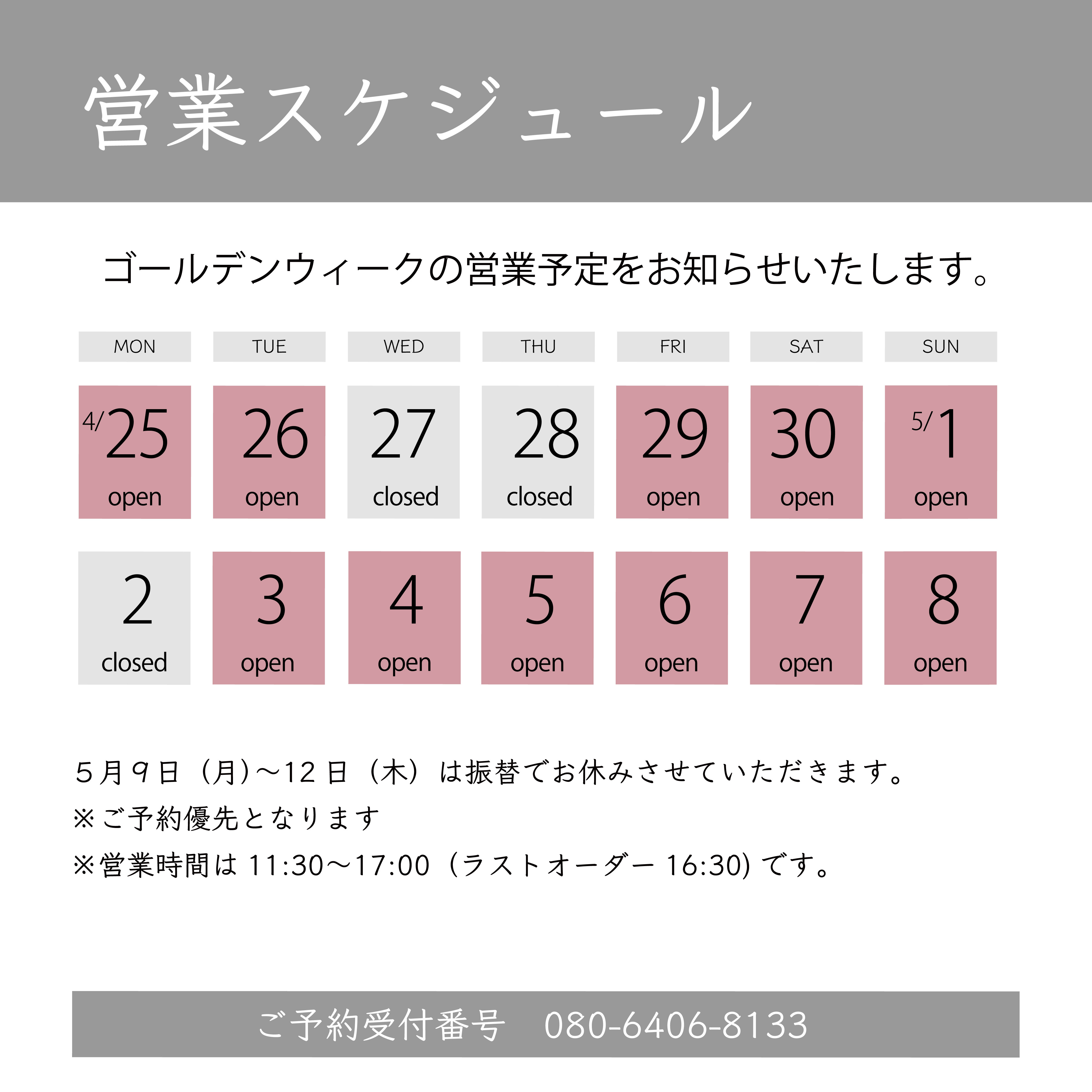 5月は2日(月)がお休み、3日(火)〜8日(日)は休まず営業いたします。